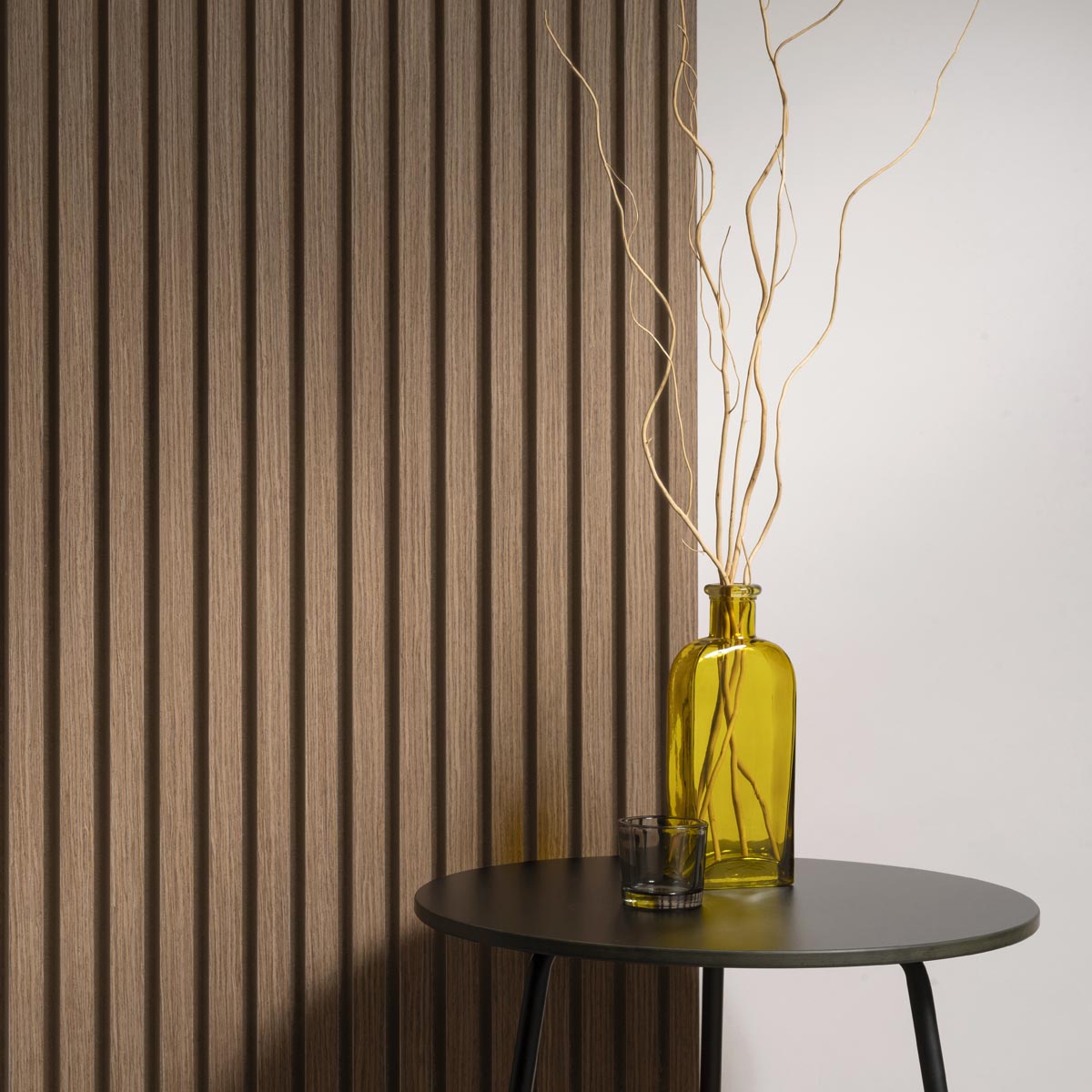 Diese skandinavisch inspirierten Wandpaneele lassen sich hervorragend mit anderen Materialien wie Strukturtapeten oder Holzdekoren kombinieren. Spiele mit Kontrasten und Oberflächen, halte es schlicht mit natürlichen Tönen oder setze ein auffälliges Highlight. Suchst du nach Akustikpaneelen in Dunkler Eiche? Dann sieh dir unser gesamtes Sortiment an Lattenwänden an oder besuche unsere Inspirationsseite, um herauszufinden, wie du die Akustik in deinem Zuhause verbessern kannst.