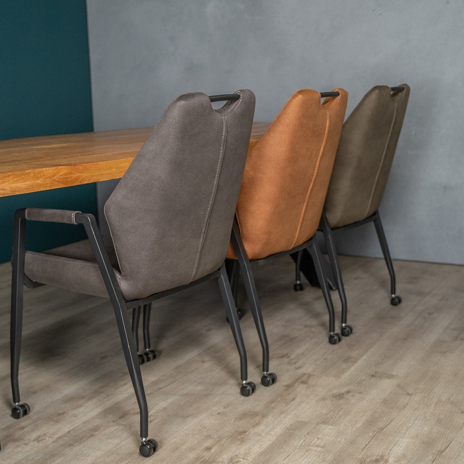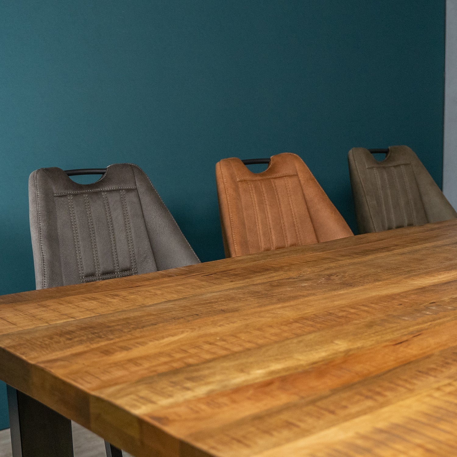 Der Esszimmerstuhl Axe wird aus hochwertiger Mikrofaser hergestellt und ist in drei verschiedenen Industriefarben erhältlich. Nämlich in Anthrazit, Cognac und Army Green. Esszimmerstühle aus Mikrofaser sind leicht zu reinigen und werden durch eine Behandlung mit unserem Textilimprägnierspray noch besser geschützt.