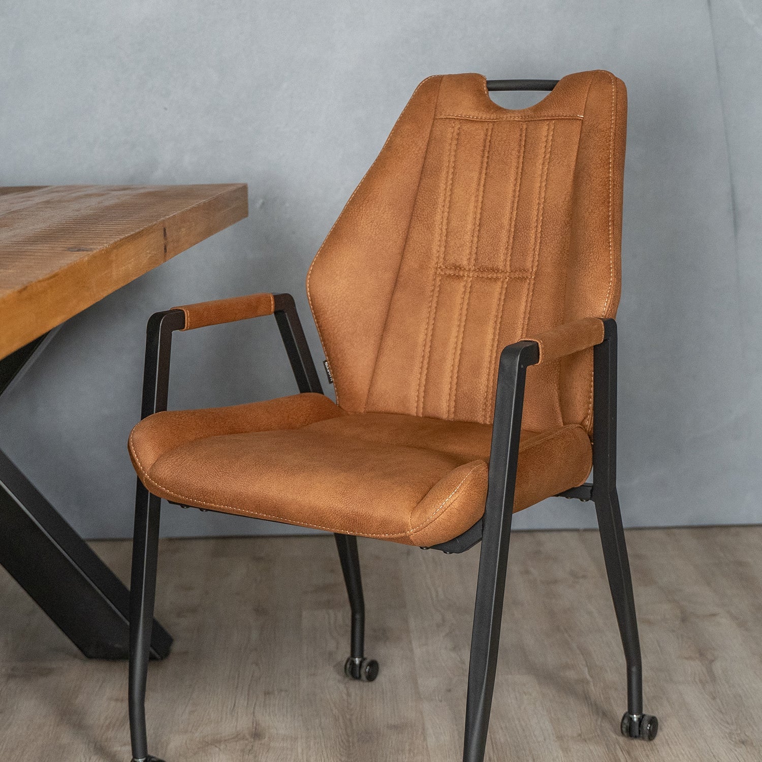 Der Esszimmerstuhl Axa hat ein wunderschönes und einzigartiges Nahtmuster auf der Innenseite der Rückenlehne, das den Stuhl wirklich einzigartig macht. Außerdem ist die Kombination aus einem Griff und den Rollen perfekt, um den Stuhl nach hinten zu schieben und bequem zu sitzen.