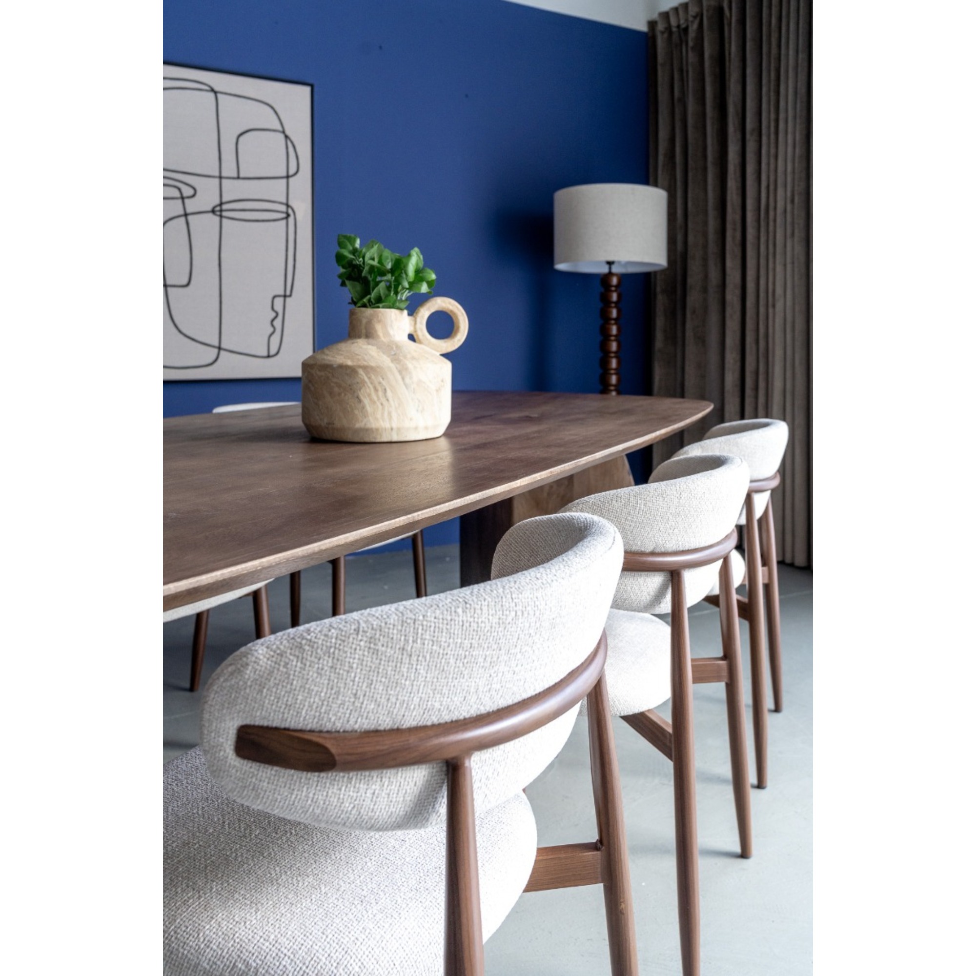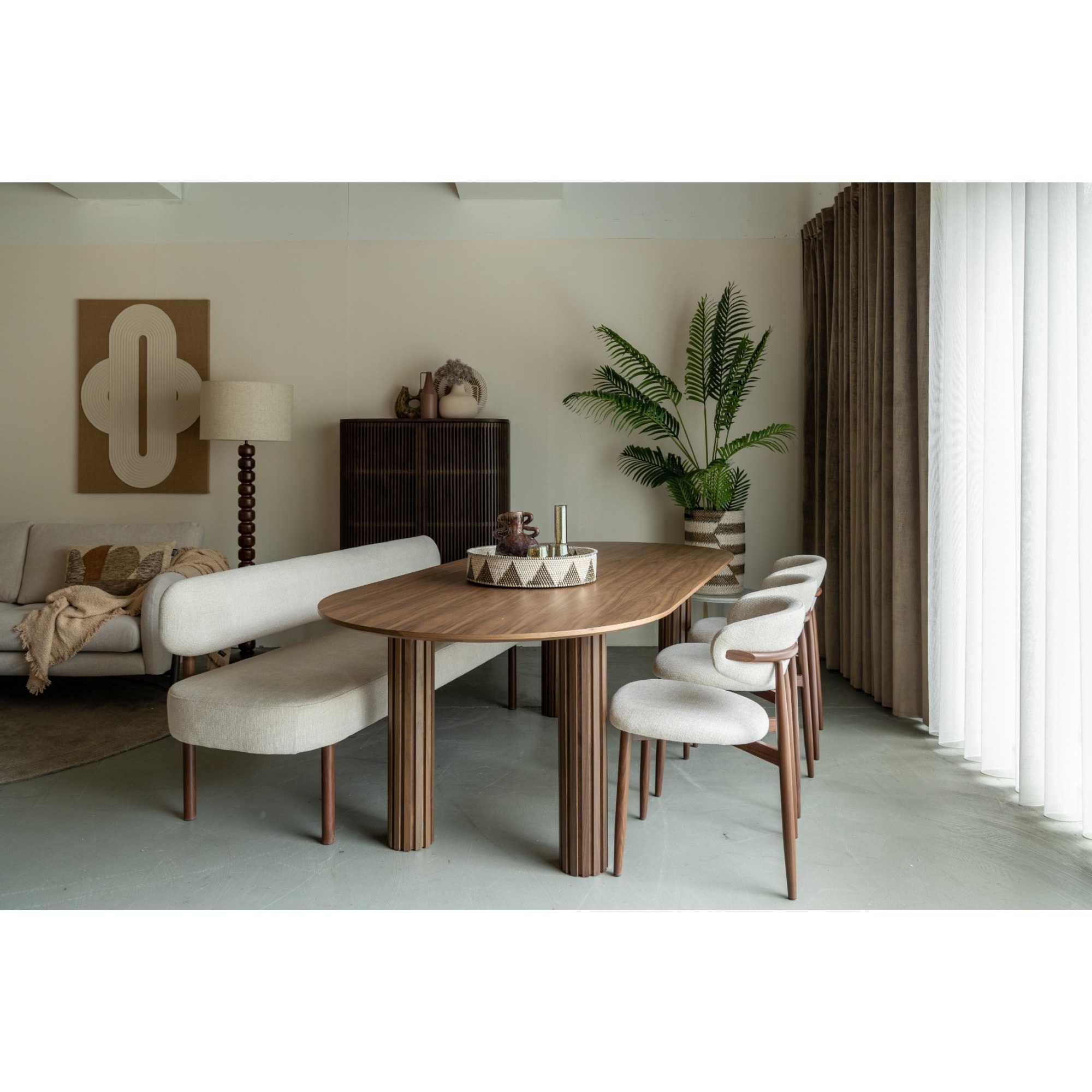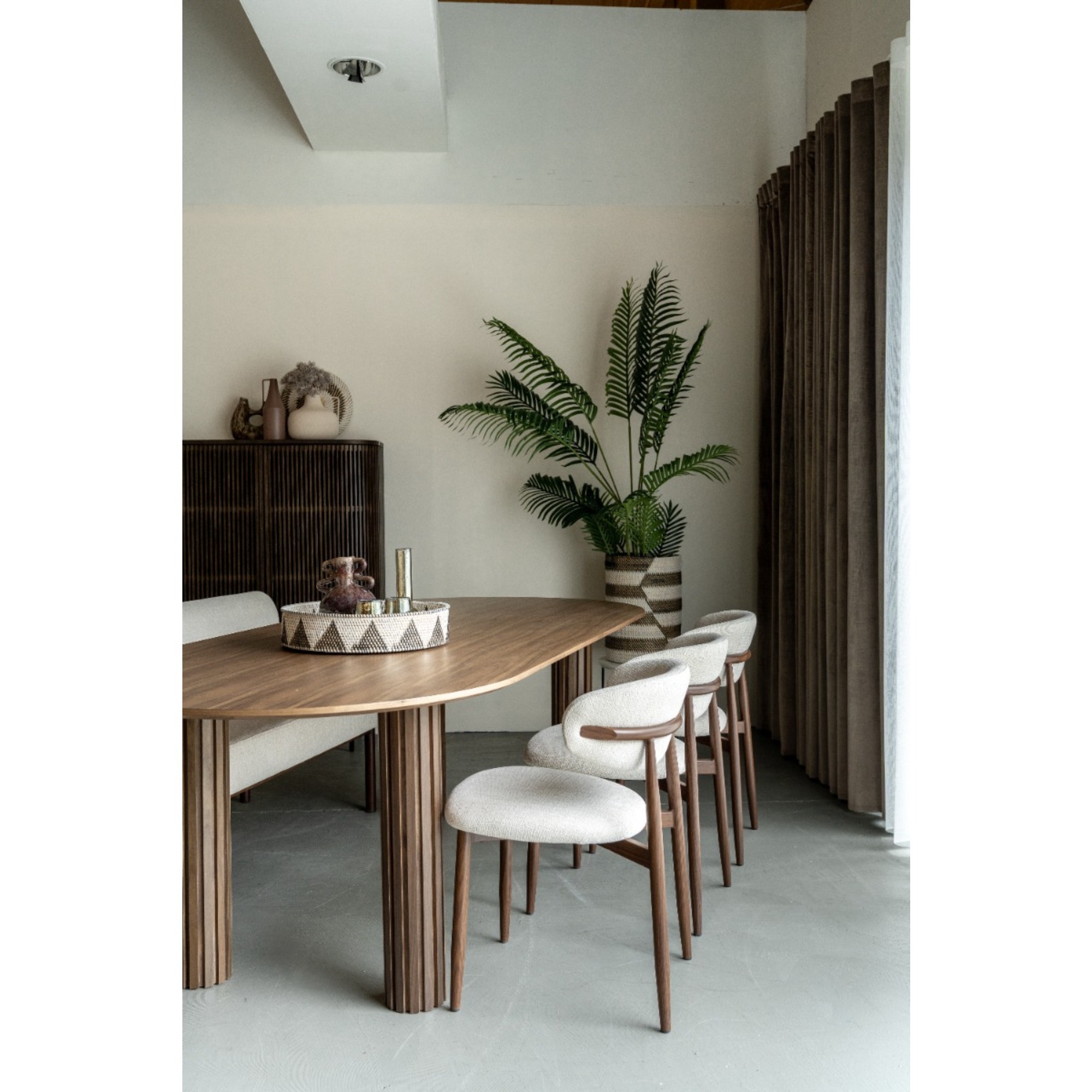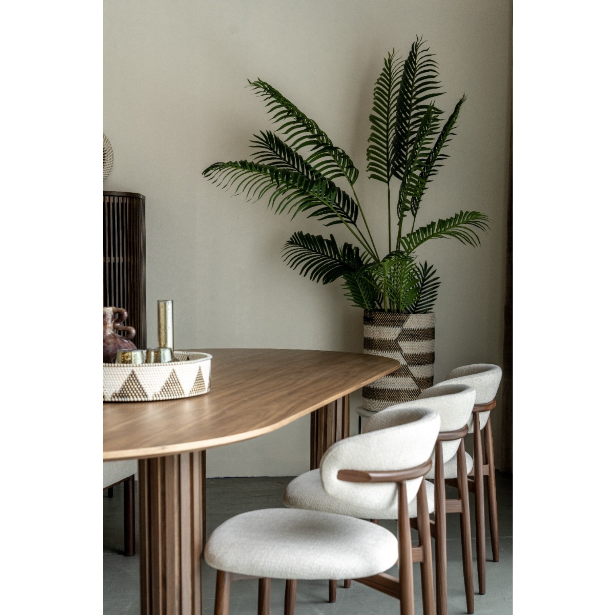 Der passende Stoff in Crème sorgt für einen eleganten Look und macht den Jessda-Stuhl zu einem echten Hingucker. Mit seinen harmonischen Farben und organischen Formen passt dieser Stuhl perfekt in ein Japandi- oder organisch eingerichtetes Interieur. Die Kombination aus natürlichen Materialien und minimalistischen Linien schafft eine ruhige, stilvolle Atmosphäre im Essbereich.