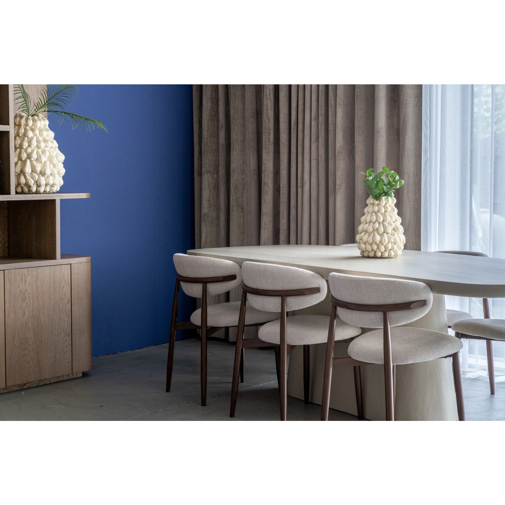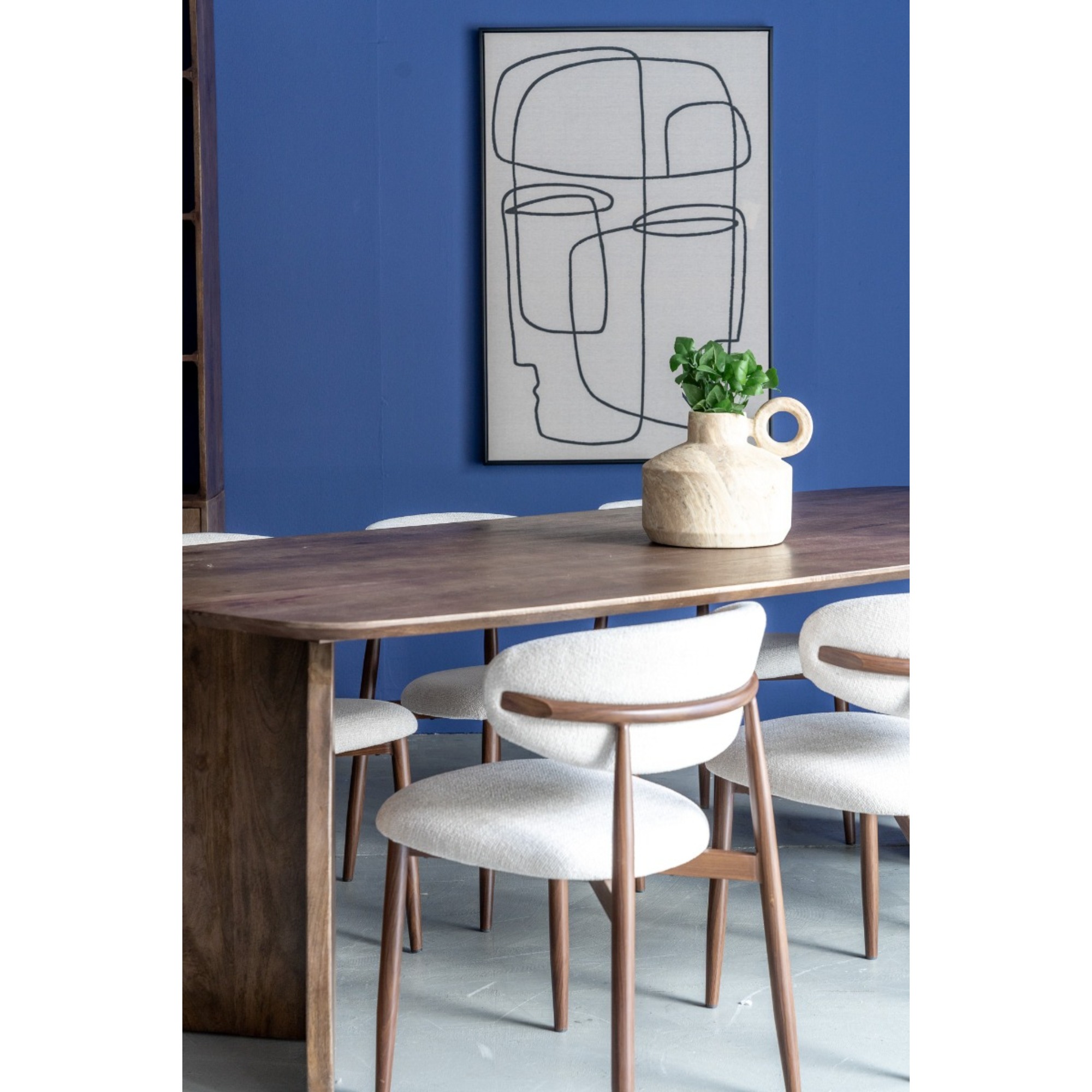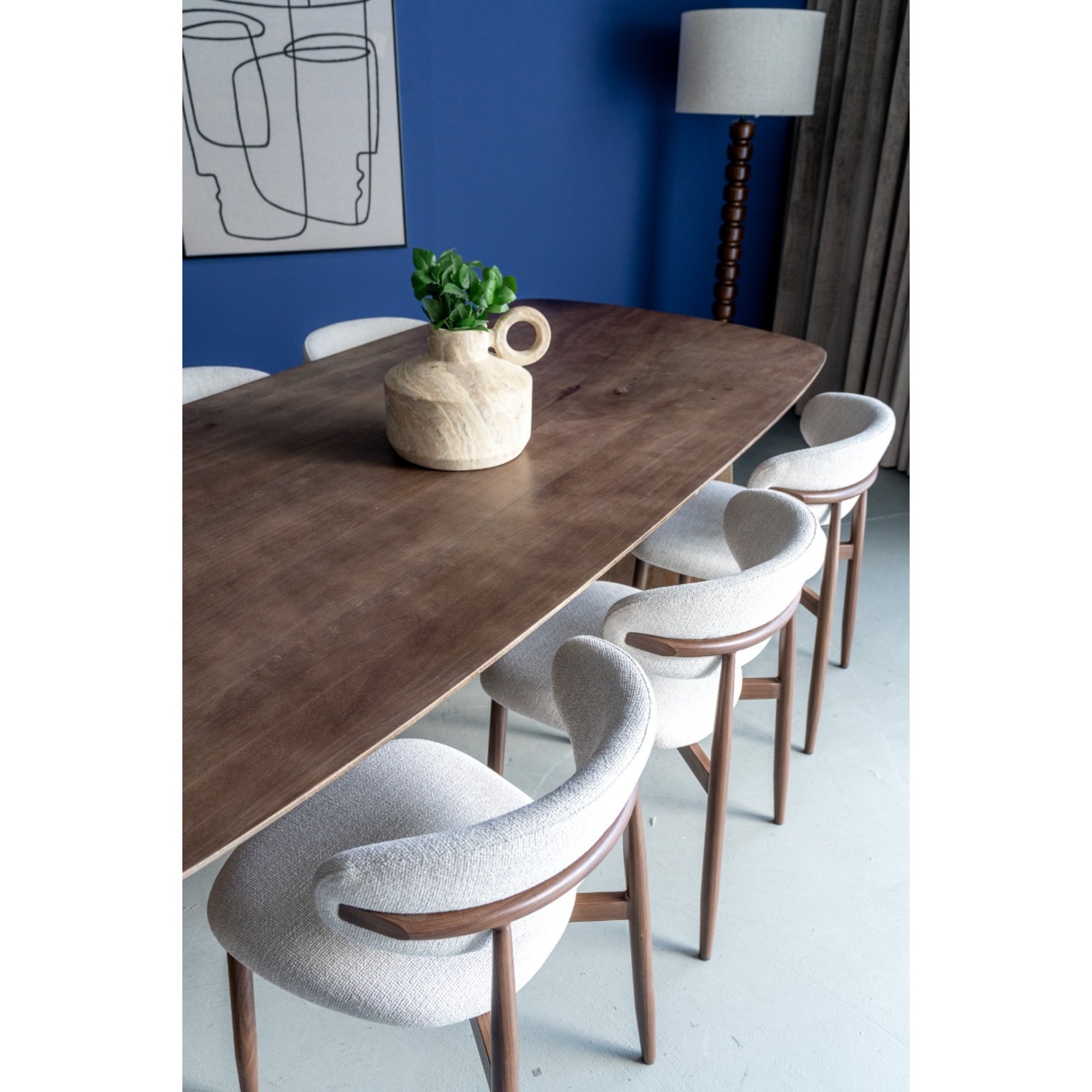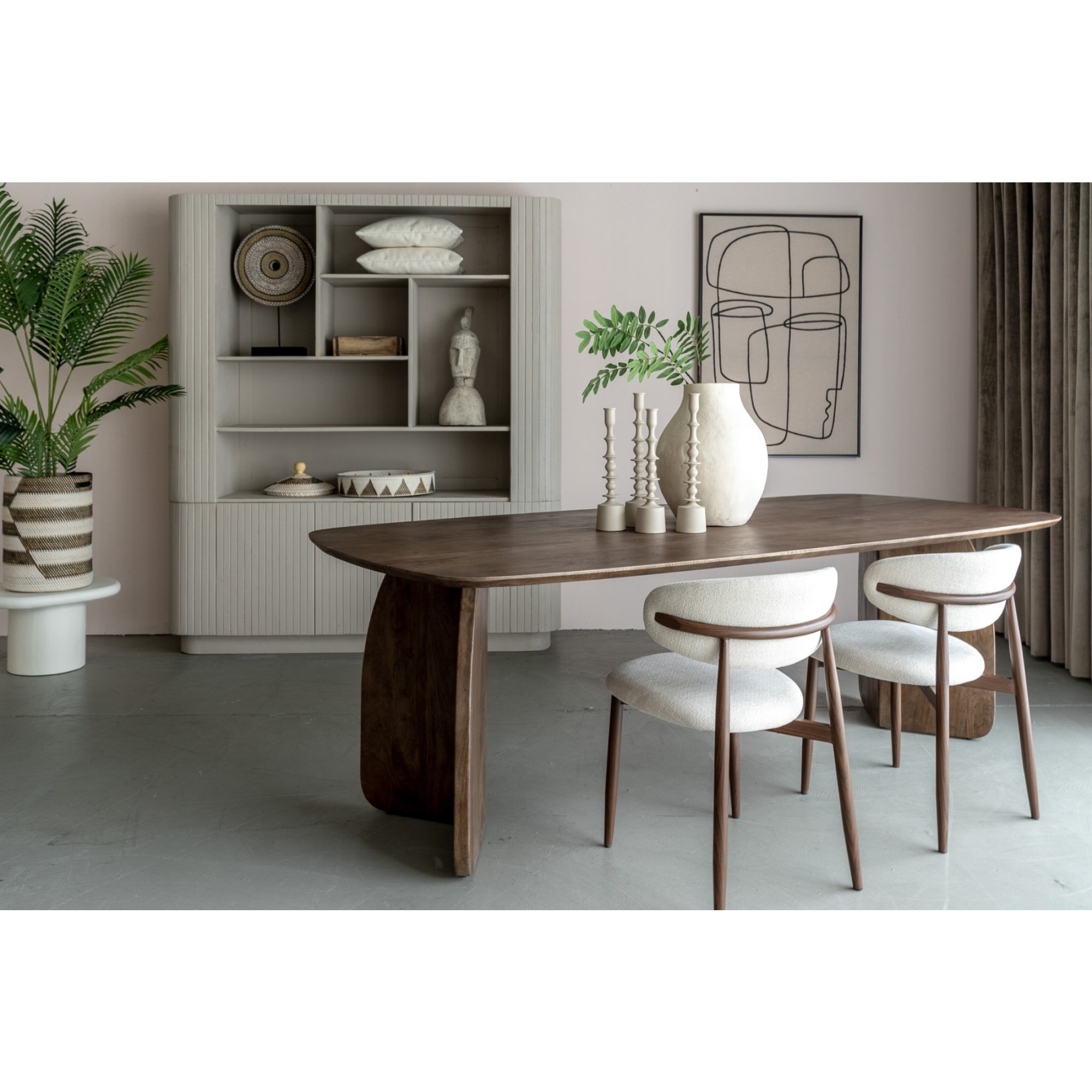 Der passende Stoff in Crème sorgt für einen eleganten Look und macht den Jessda-Stuhl zu einem echten Hingucker. Mit seinen harmonischen Farben und organischen Formen passt dieser Stuhl perfekt in ein Japandi- oder organisch eingerichtetes Interieur. Die Kombination aus natürlichen Materialien und minimalistischen Linien schafft eine ruhige, stilvolle Atmosphäre im Essbereich.